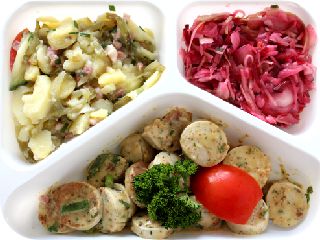 Bayrischer Weißwurstsalat, Krautsalat, Speckkartoffelsalat