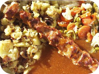Paniertes Schweinenackenschnitzel in Bratensauce, Mischgemüse, Salzkartoffeln